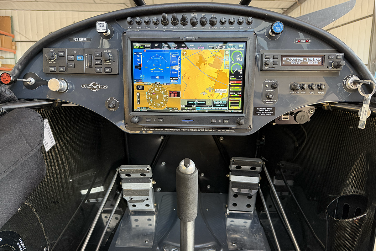 Instrument Panel - In typical Cubcrafters fashion, this Carbon Cub FX-2 has a well appointed VFR instrument panel which will please even the most discerning pilot. The Garmin G3X-style touchscreen glass panel provides all of the standard functionality, including ADS-B Out and In. The Garmin GFC-500-style 2-axis autopilot eases the load on cross-country flights. Both USB-A and socket-style 12v power outlets are mounted at the lower right corner of the panel.