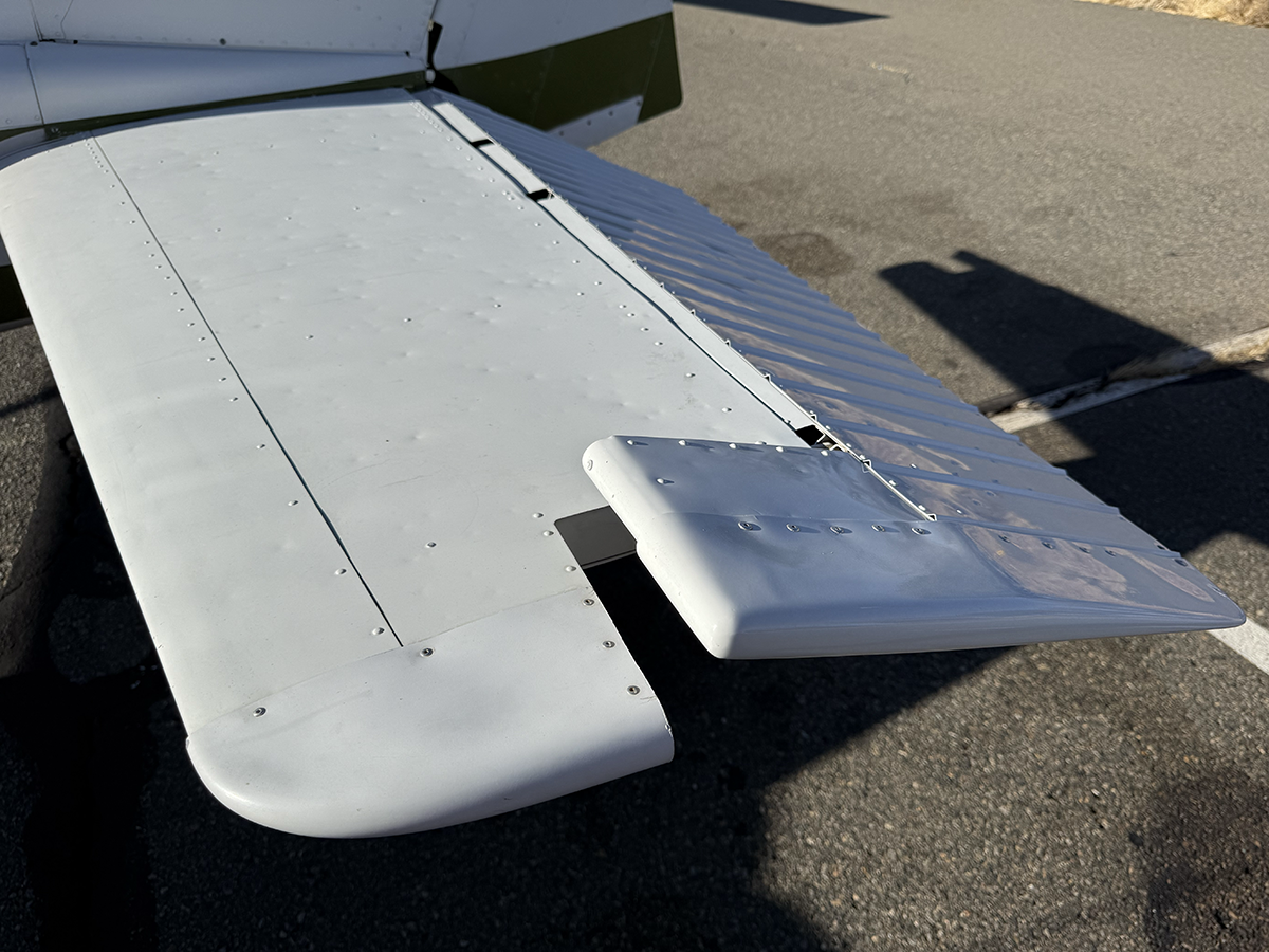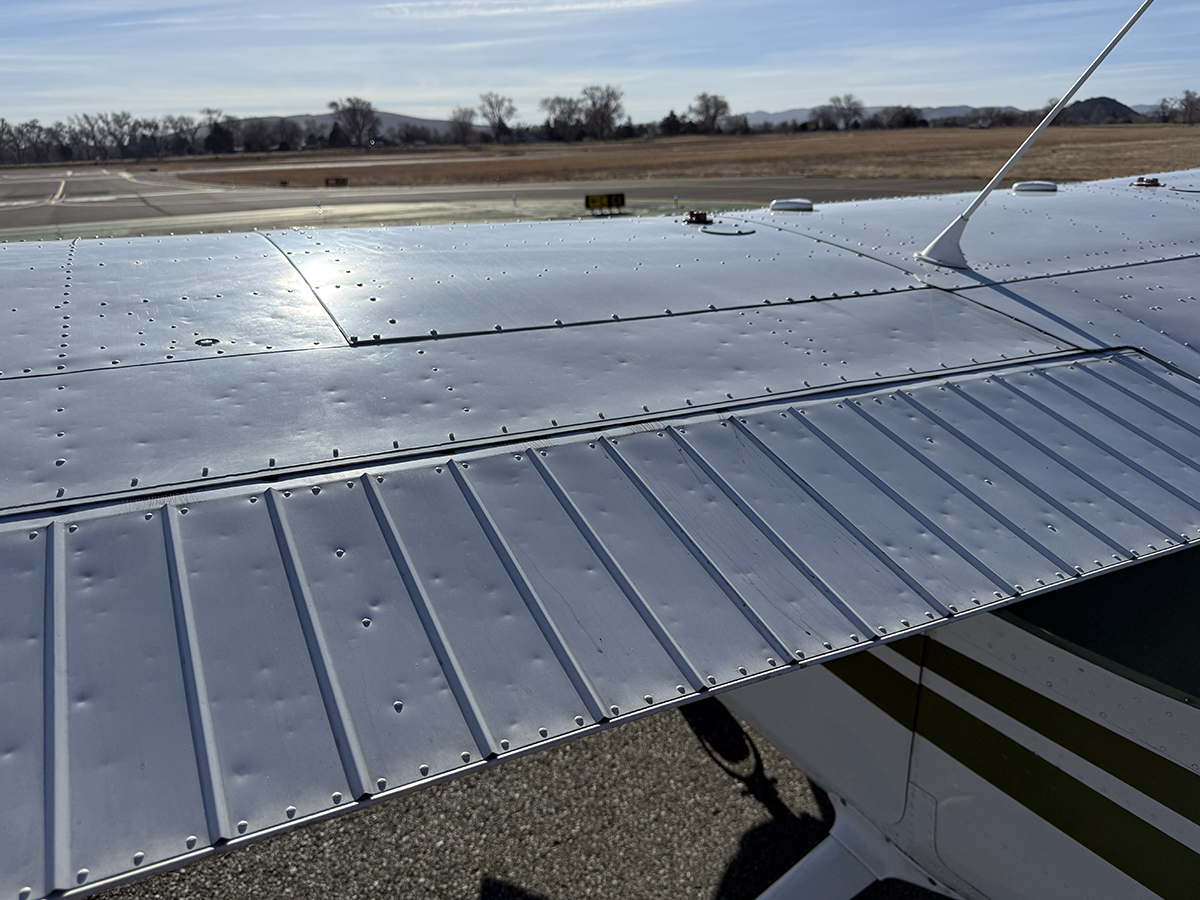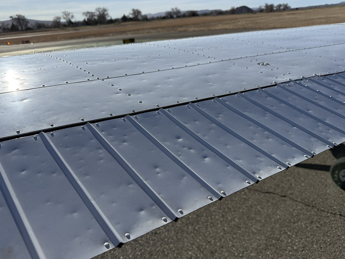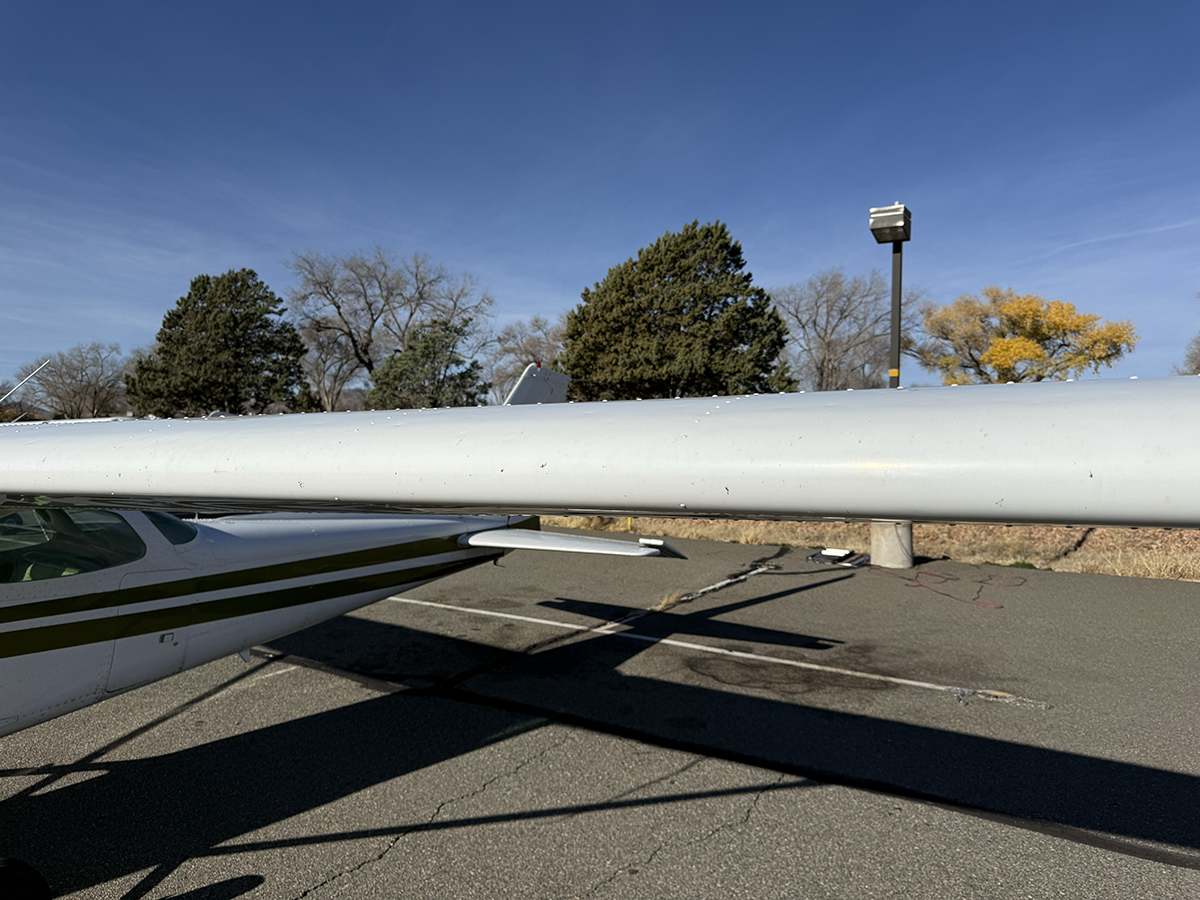 The aluminum does not show any signs of hangar rash and is straight. There is some hail damage on top surfaces, primarily on the top of the wings (only cosmetic, no airworthiness issues). The fiberglass wingtips and horizontal stabilizer tips are in good condition.