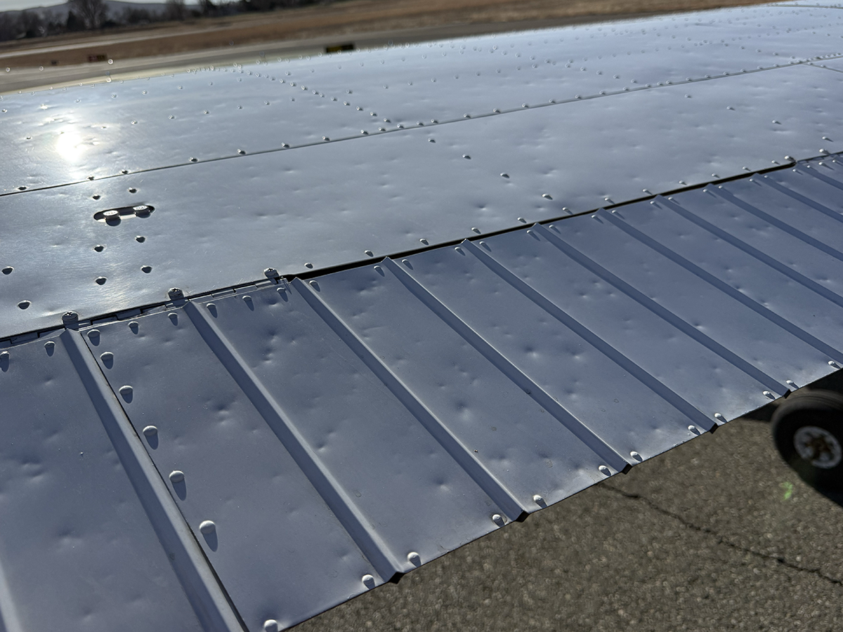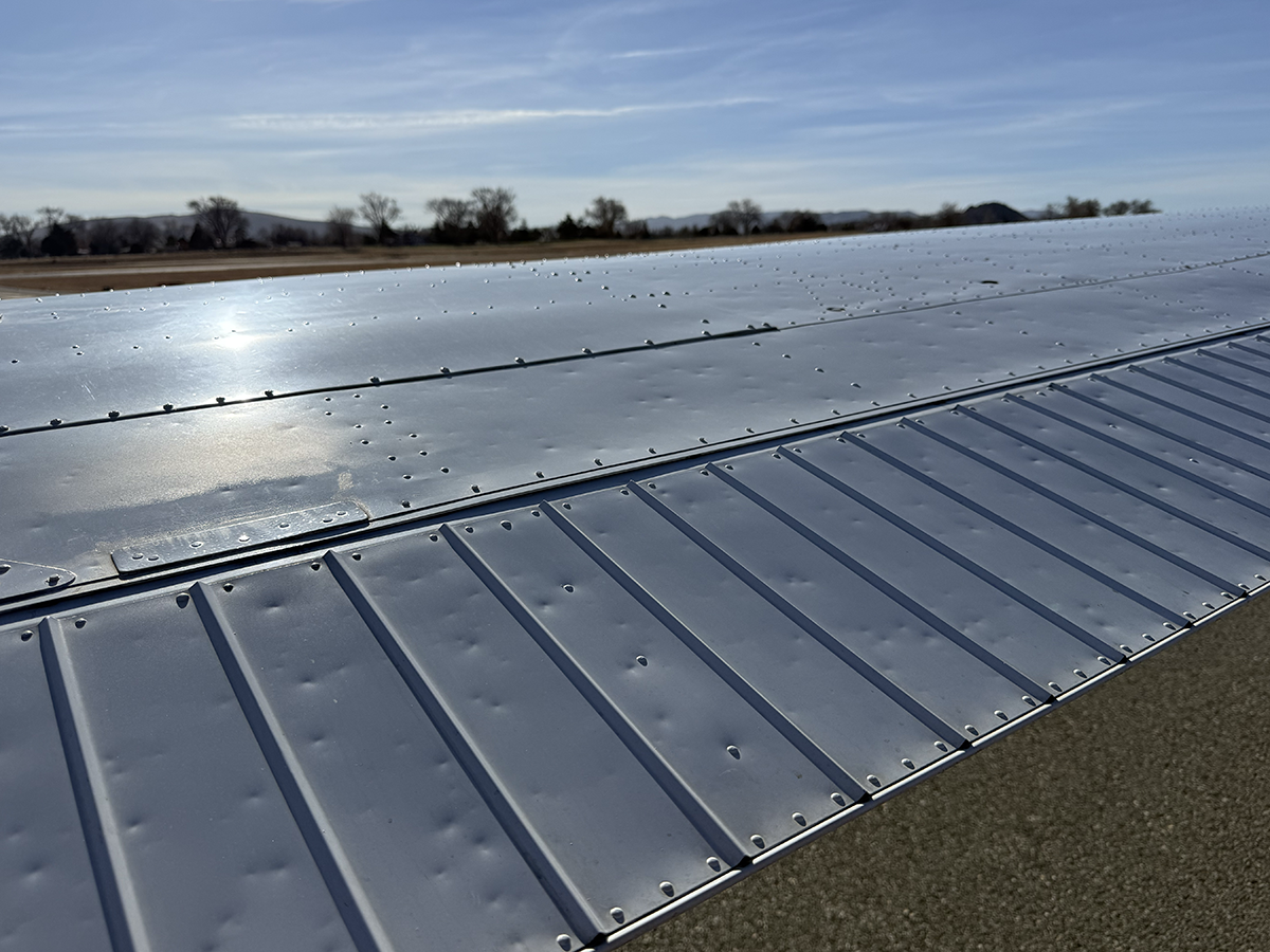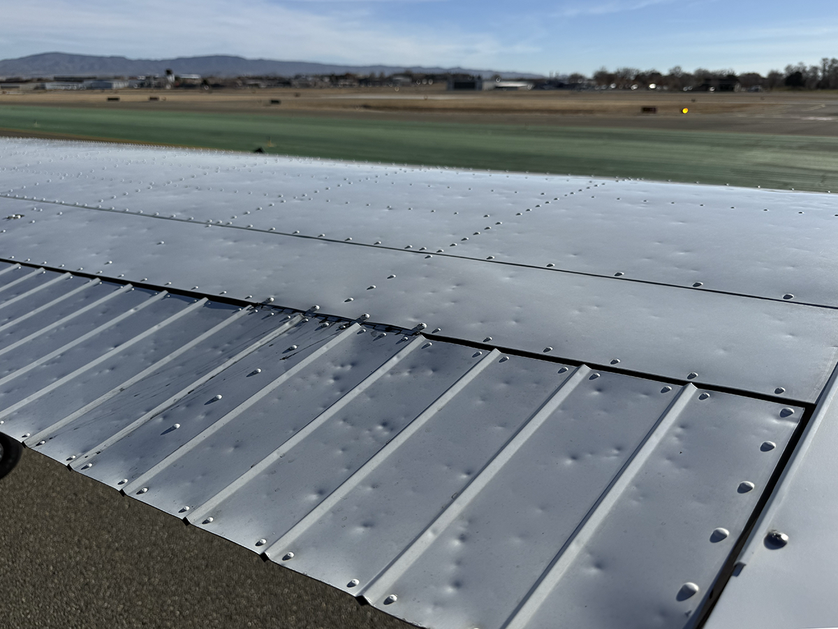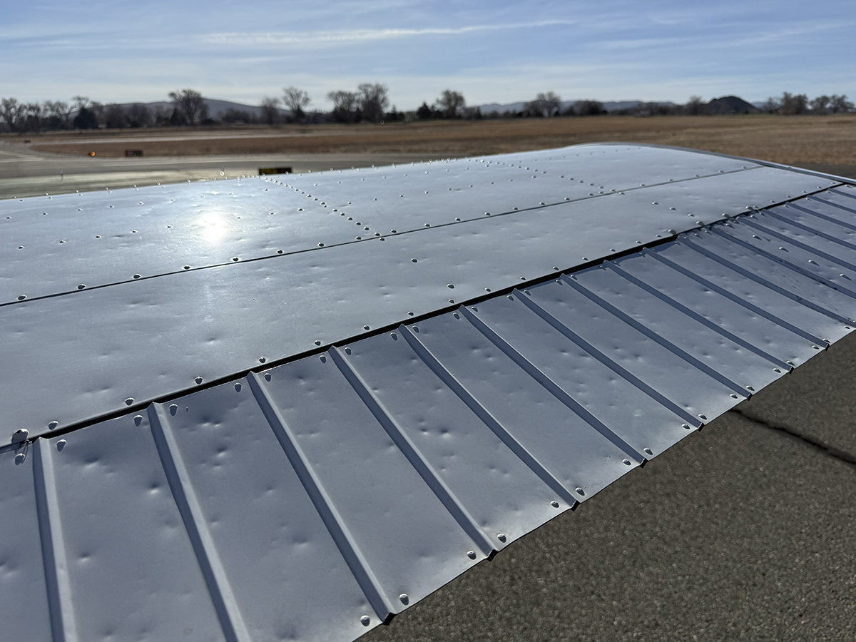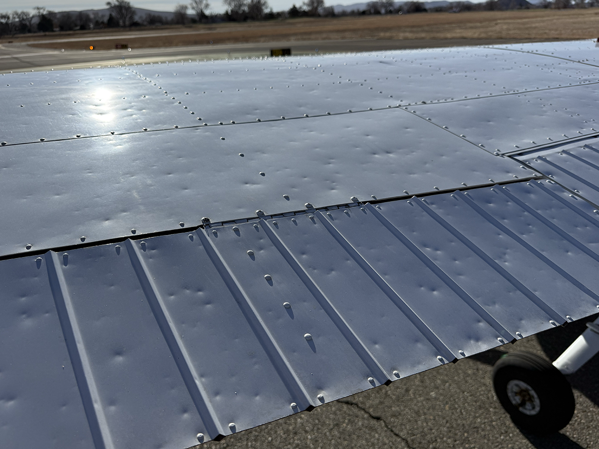 The aluminum does not show any signs of hangar rash and is straight. There is some hail damage on top surfaces, primarily on the top of the wings (only cosmetic, no airworthiness issues). The fiberglass wingtips and horizontal stabilizer tips are in good condition.