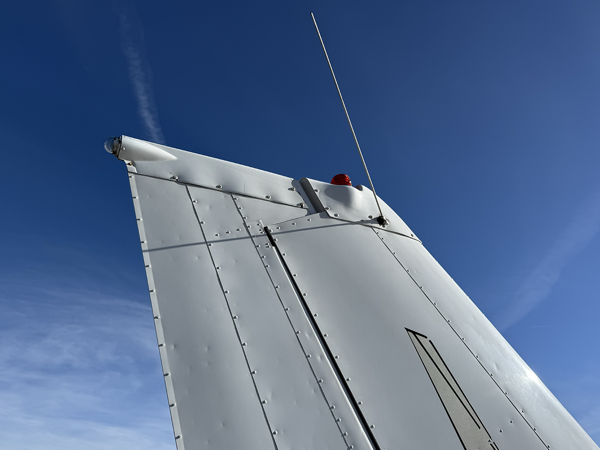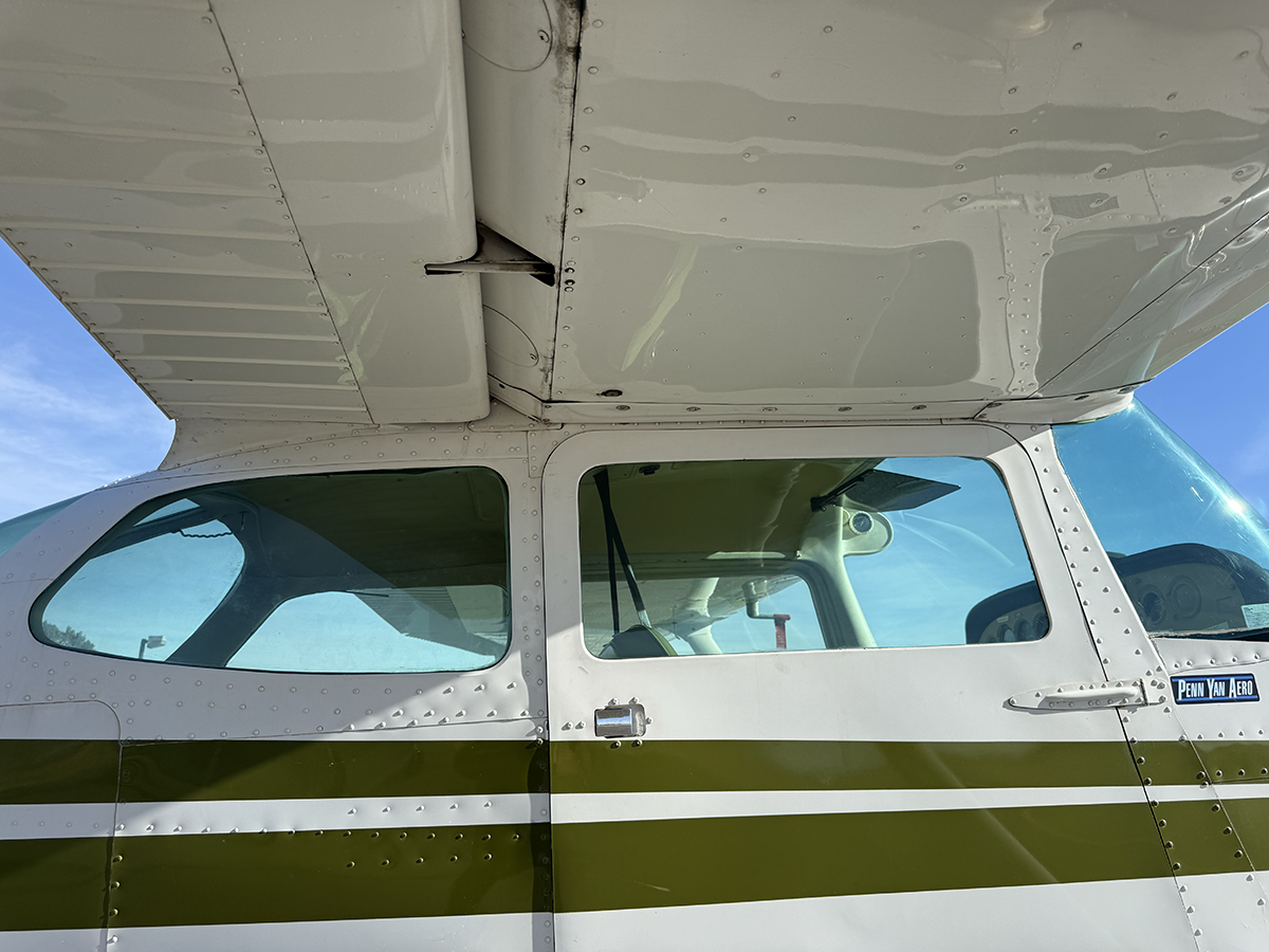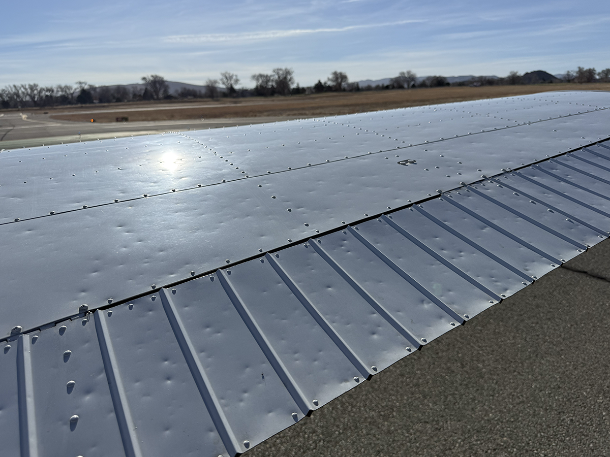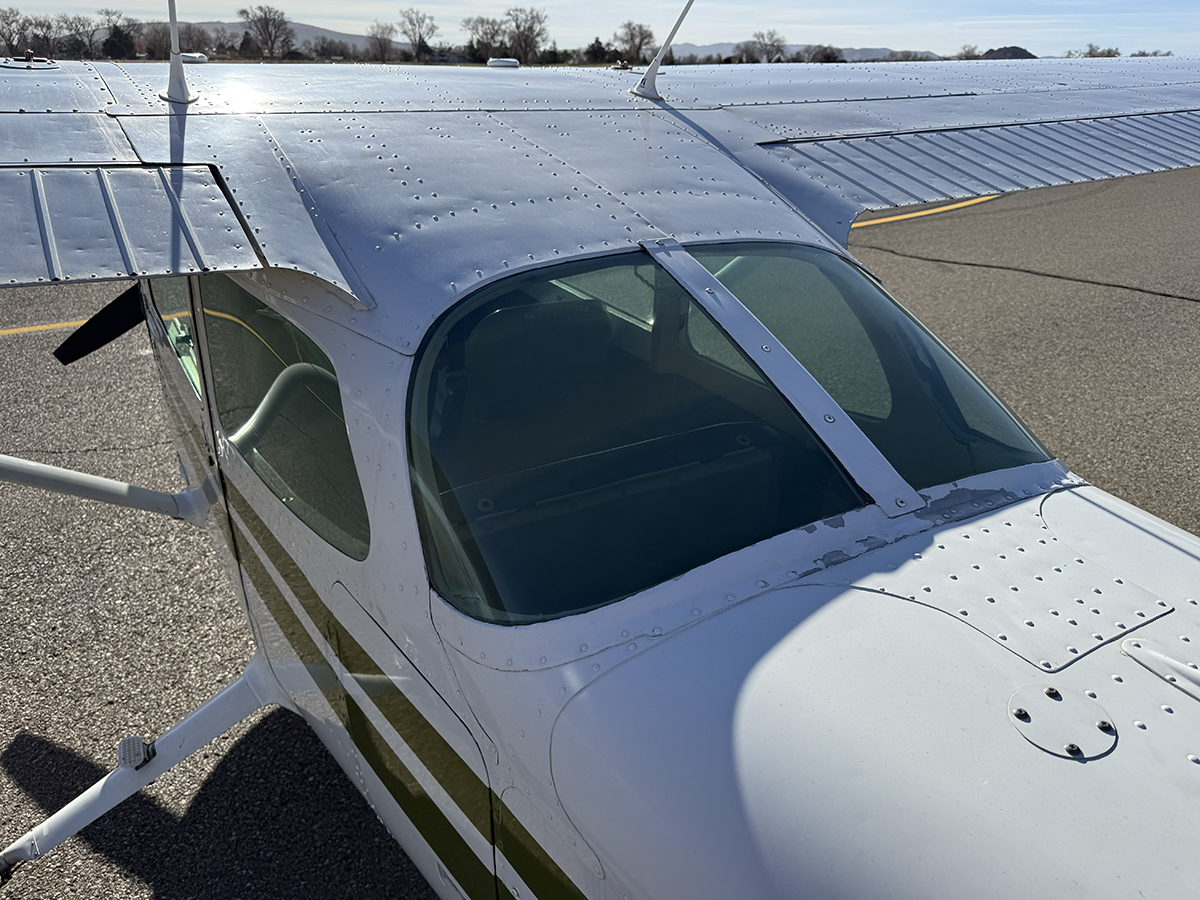 The aluminum does not show any signs of hangar rash and is straight. There is some hail damage on top surfaces, primarily on the top of the wings (only cosmetic, no airworthiness issues). The fiberglass wingtips and horizontal stabilizer tips are in good condition.