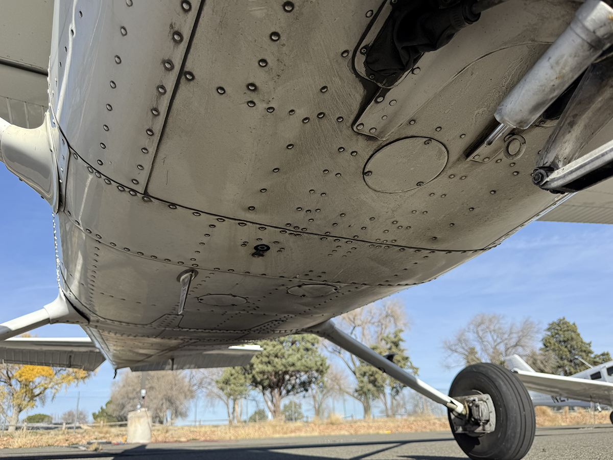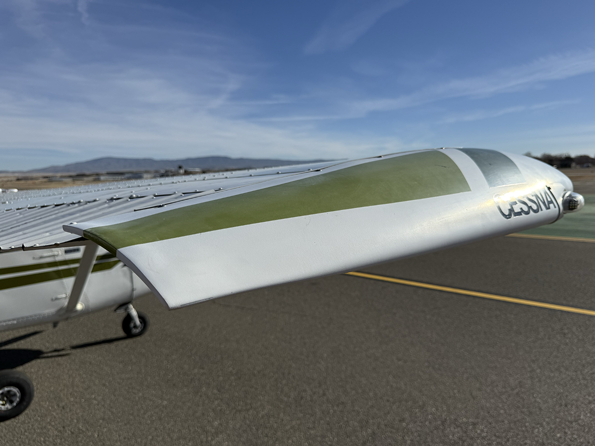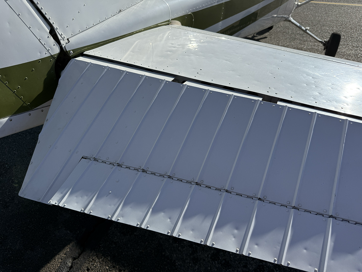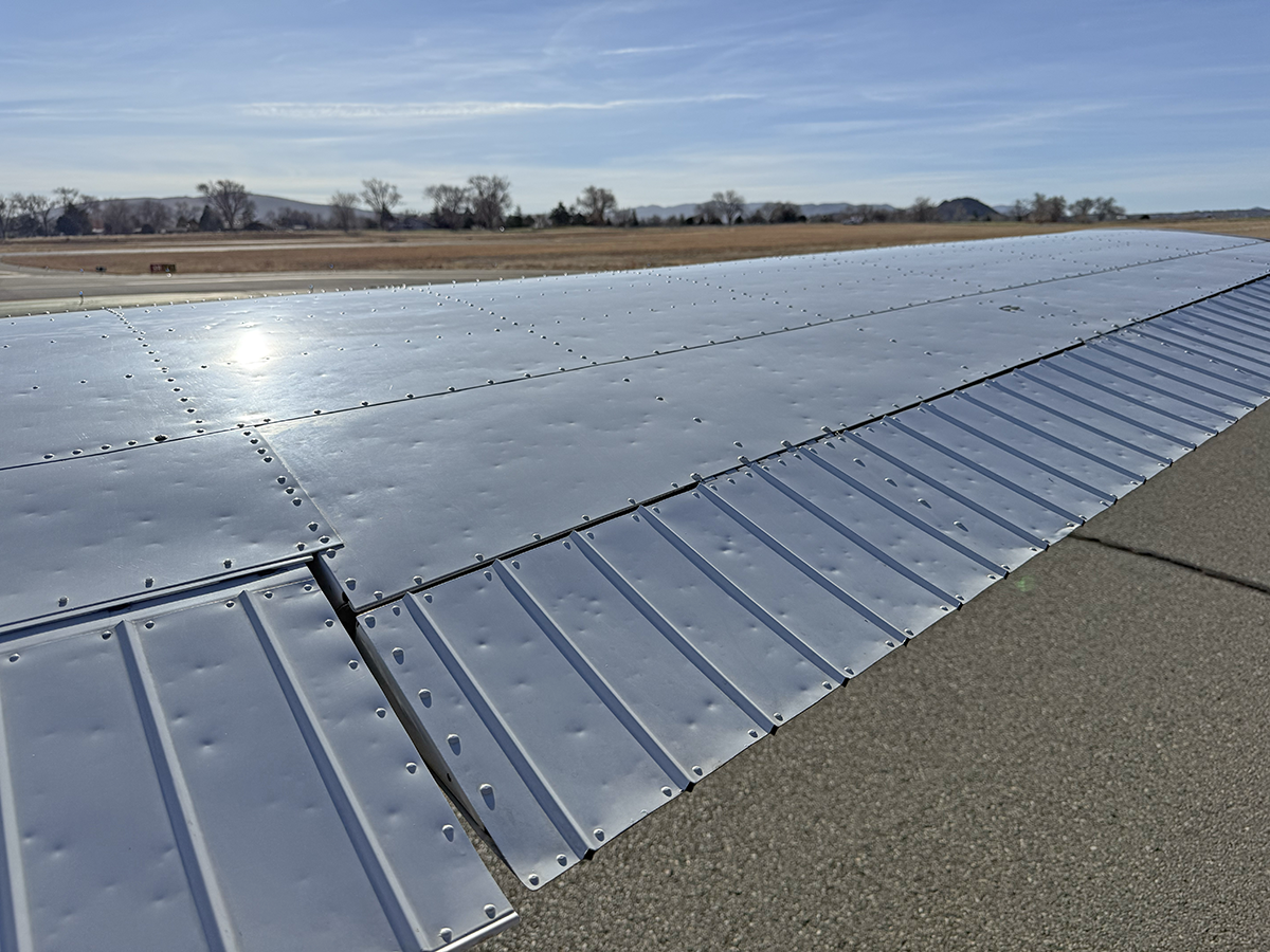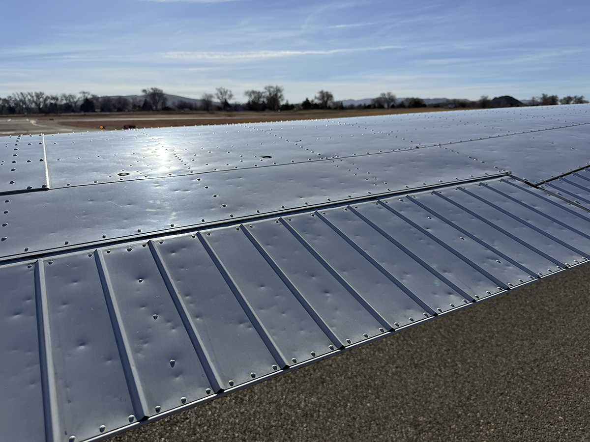 The aluminum does not show any signs of hangar rash and is straight. There is some hail damage on top surfaces, primarily on the top of the wings (only cosmetic, no airworthiness issues). The fiberglass wingtips and horizontal stabilizer tips are in good condition.