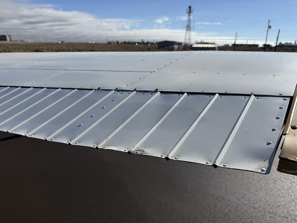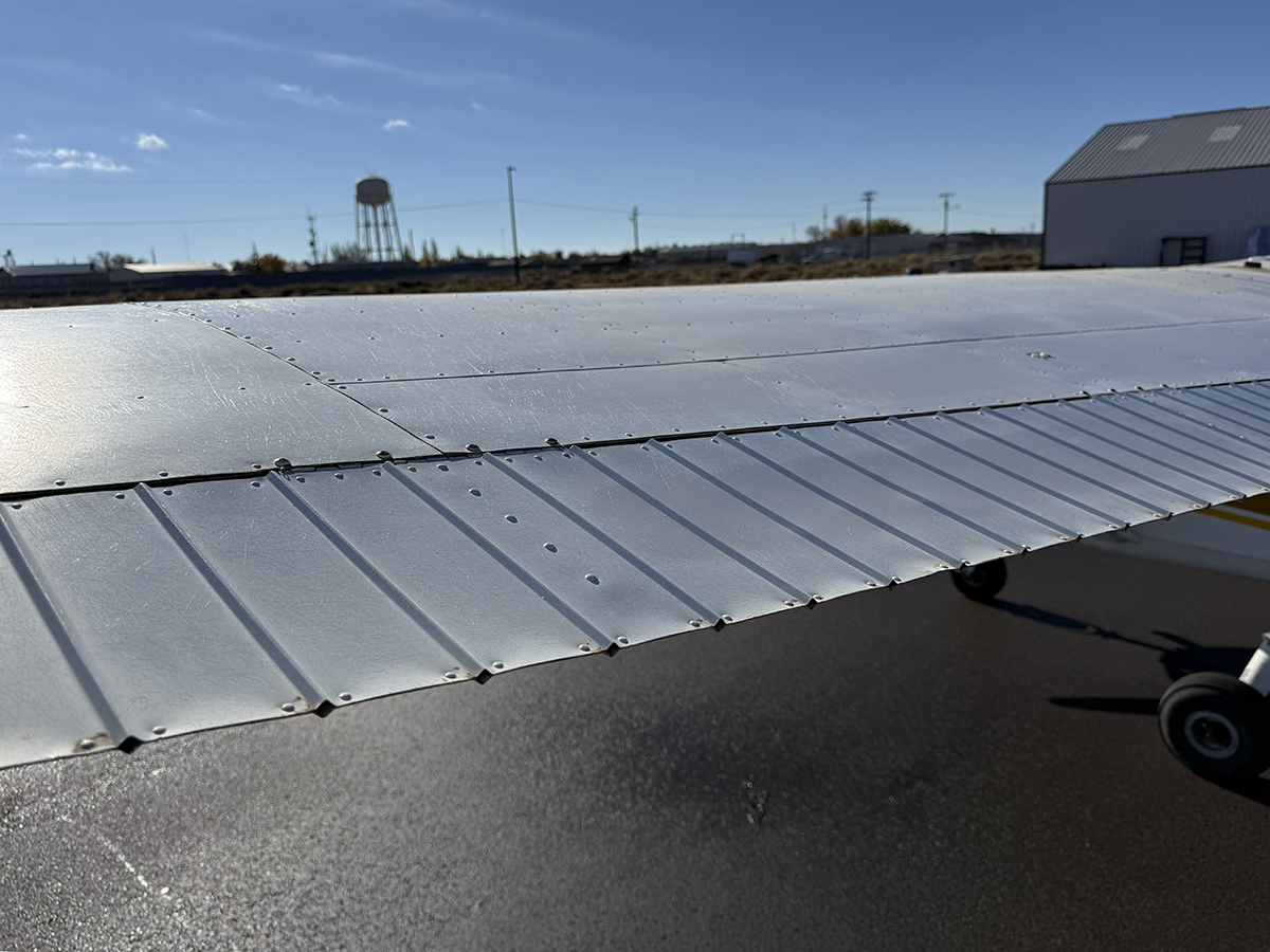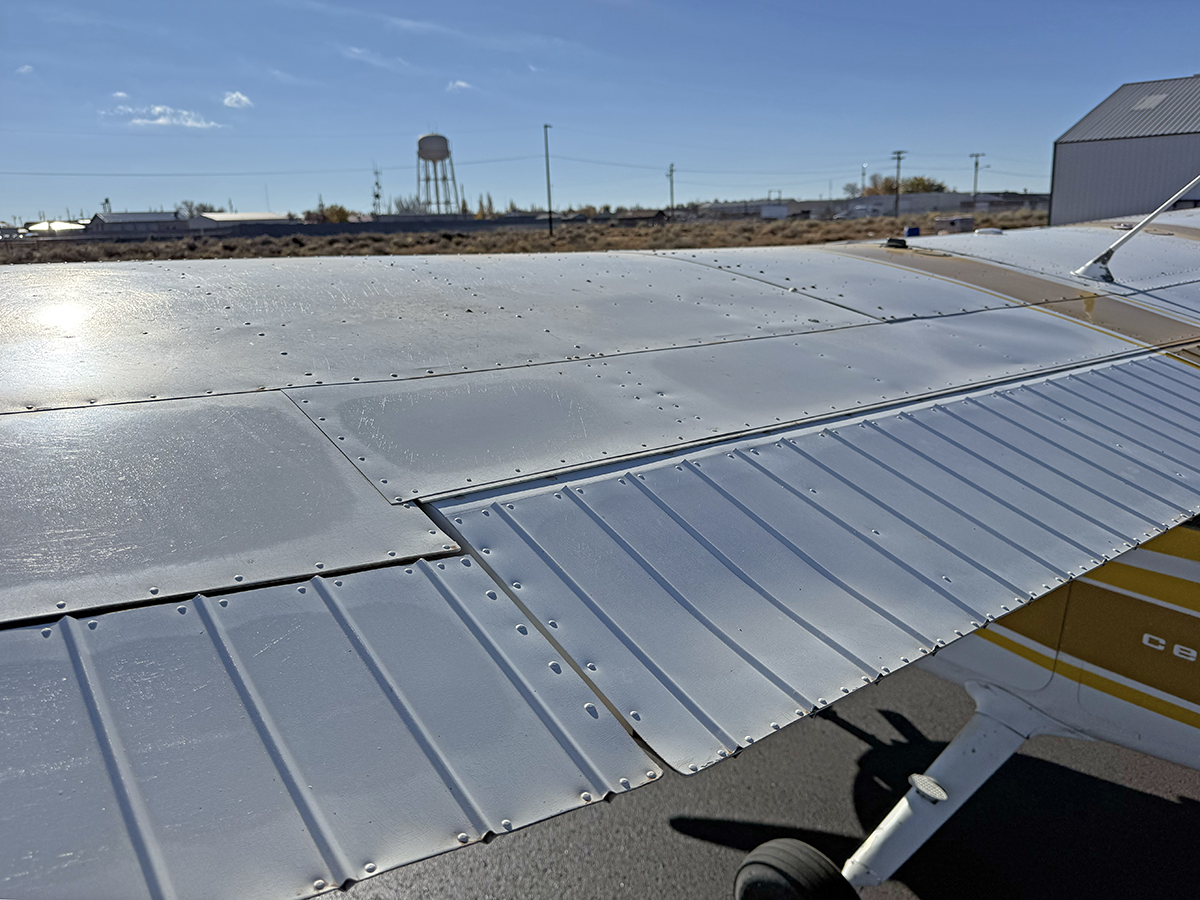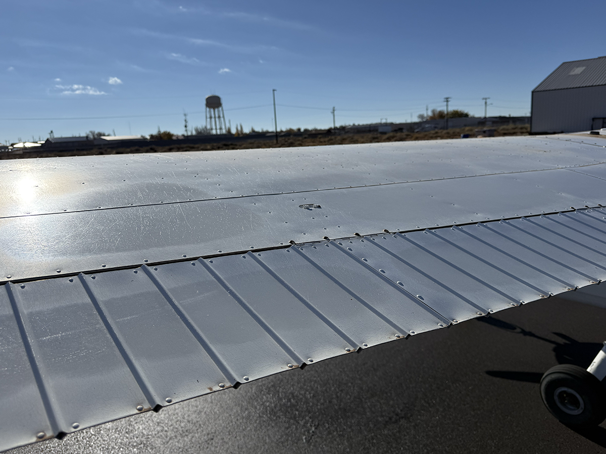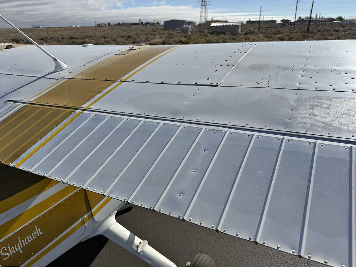 The aluminum on this Skyhawk is overall straight and in good condition. The right aileron shows some very minor hangar rash, and the rudder skin shows some very minor deformations. The left main gear cover has a minor deformation.