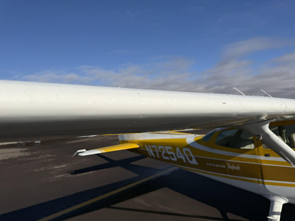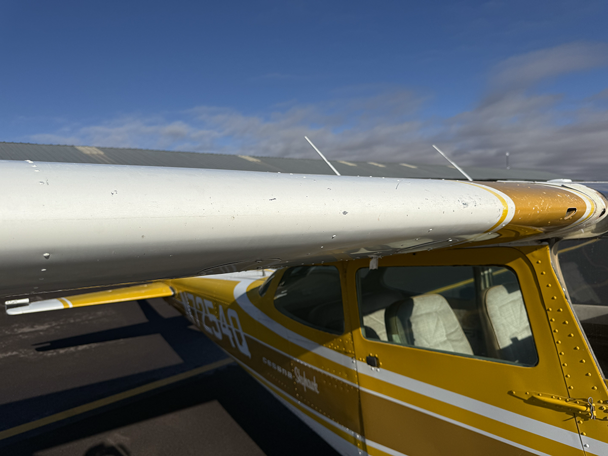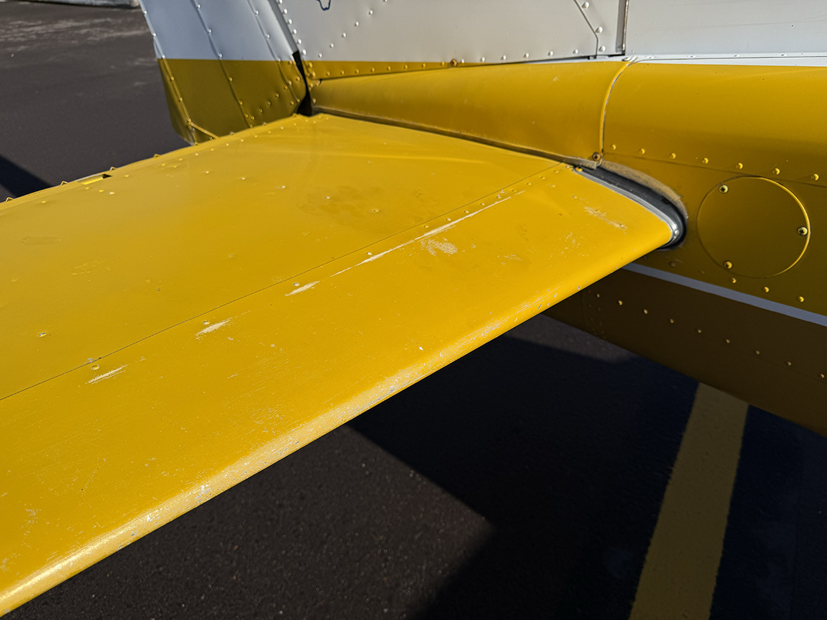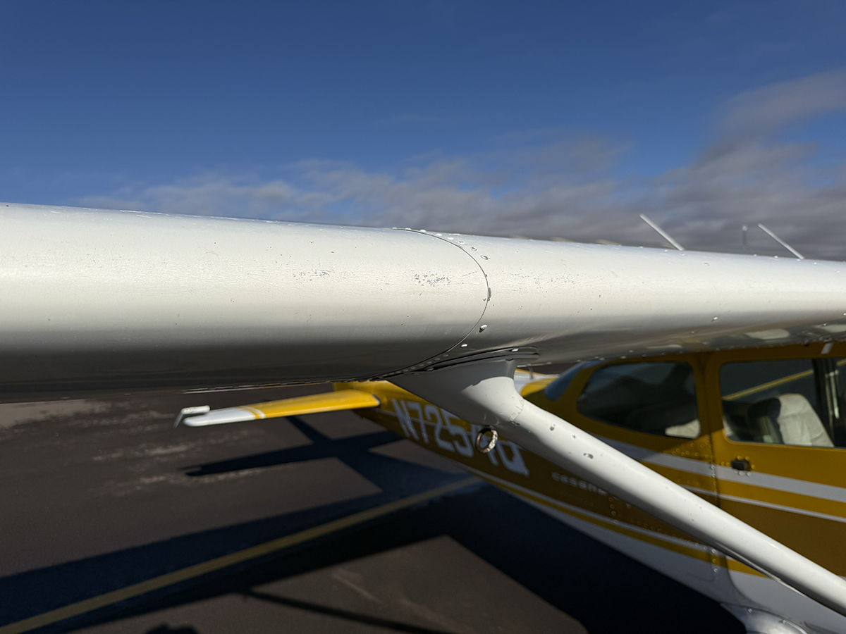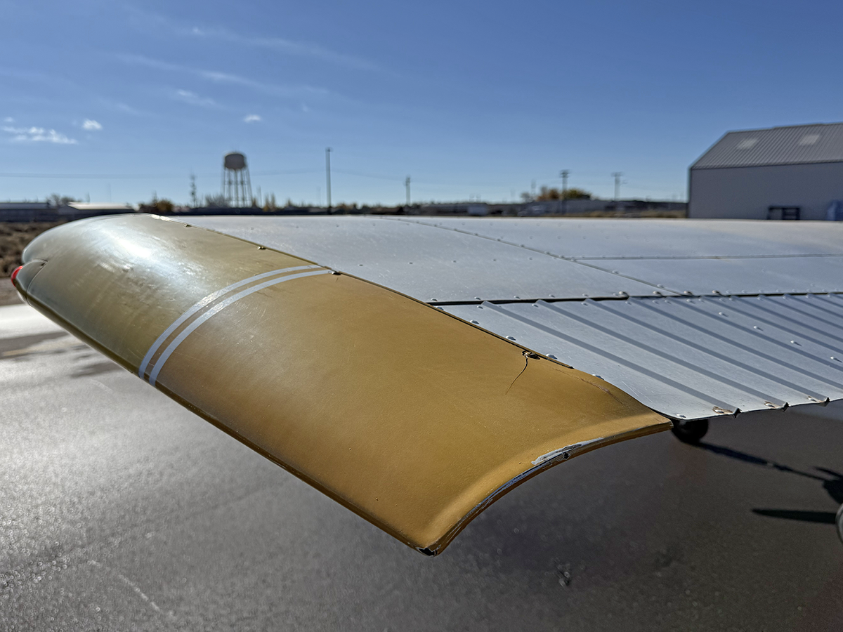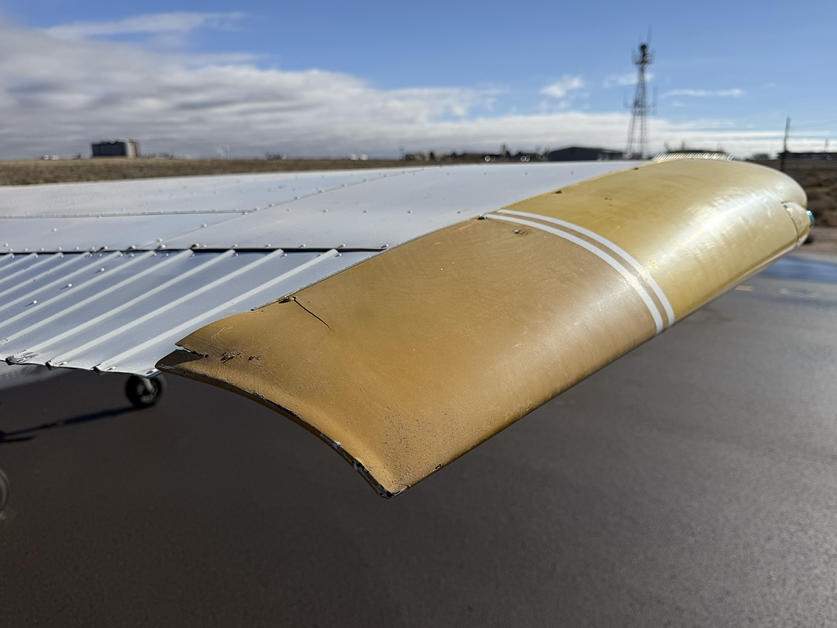 The aluminum on this Skyhawk is overall straight and in good condition. The right aileron shows some very minor hangar rash, and the rudder skin shows some very minor deformations. The left main gear cover has a minor deformation.