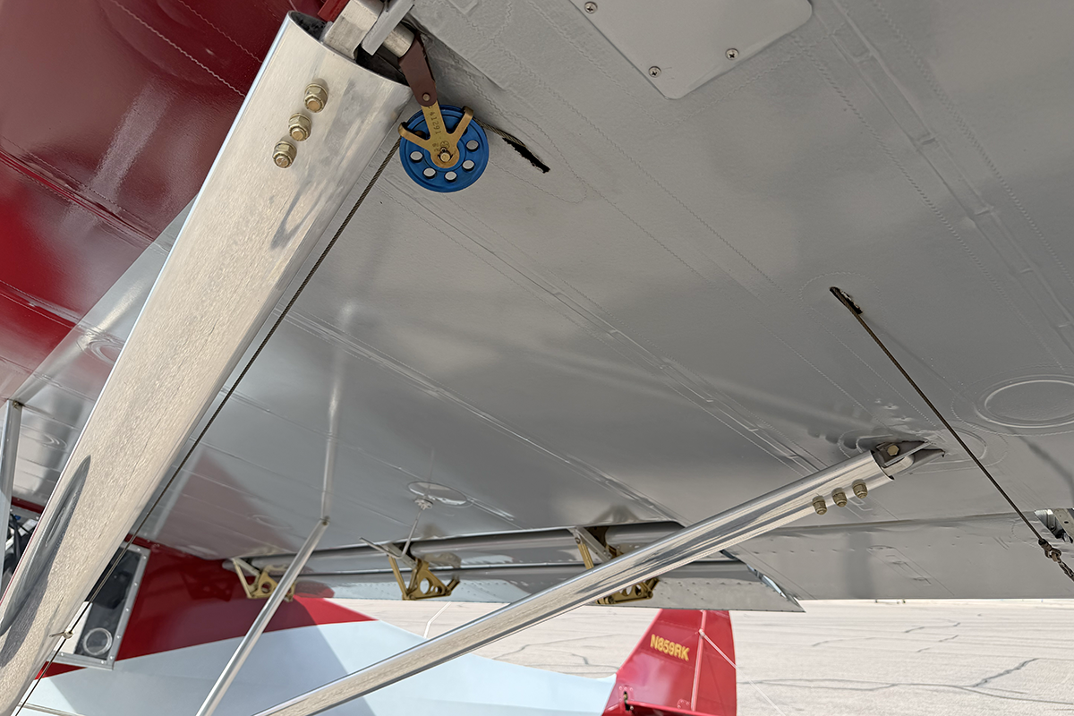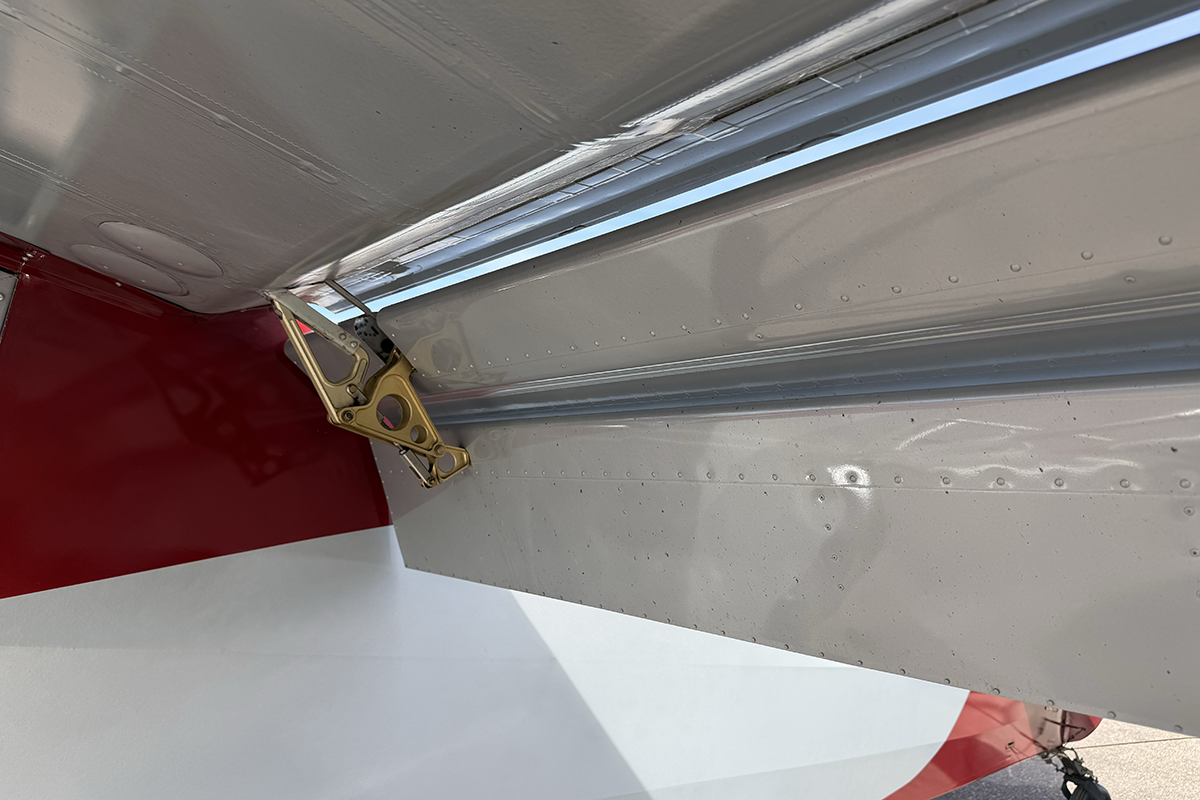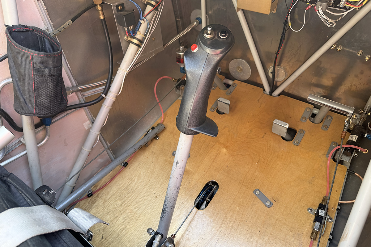 N859RK has a fantastic mechanism for dumping flaps after landing. While flaps are set using a traditional lever (similar to what's found in a Super Cub), flaps are retracted using a trigger on the control stick. STOL pilots, especially competitors, will find this very useful on landing. Flap retraction is rapid, which is ideal for immediately transferring wing lift to weight on the wheels.