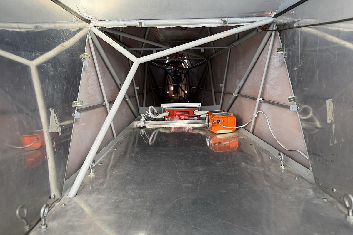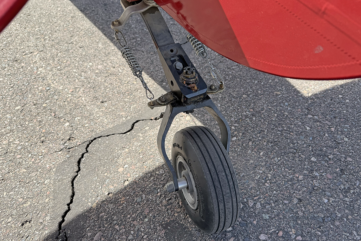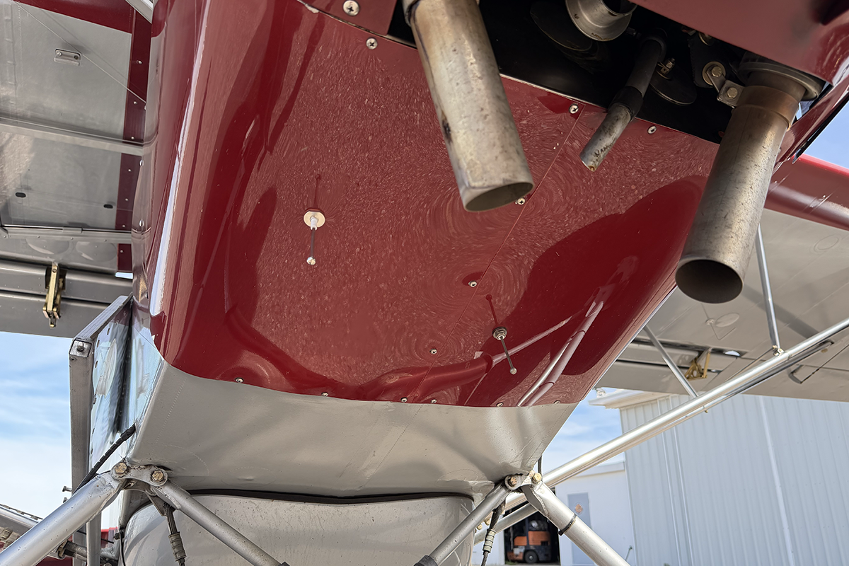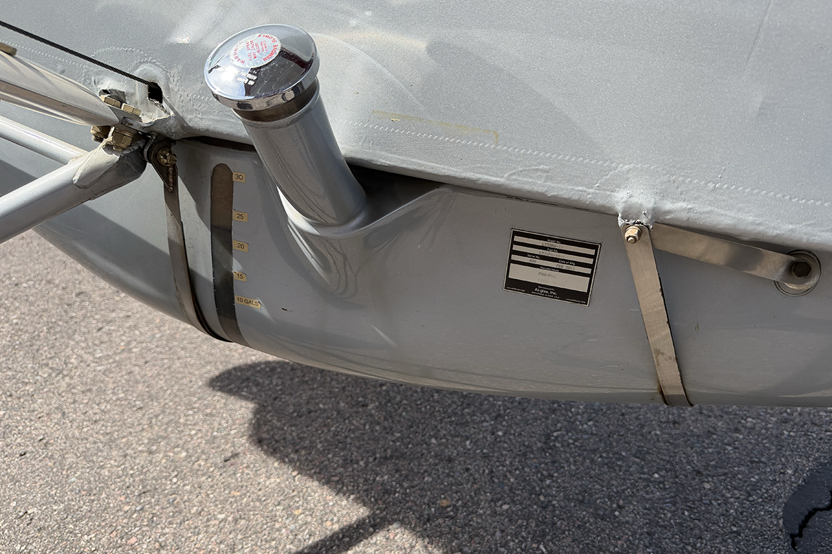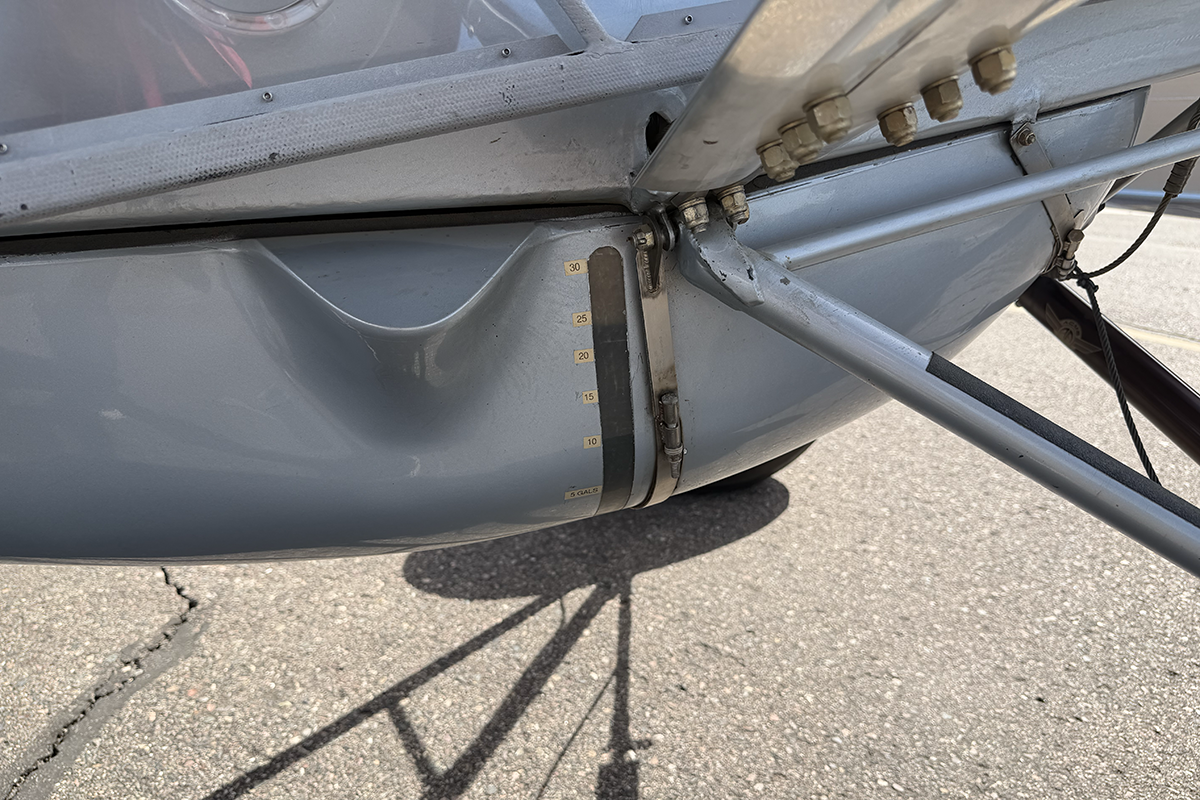 N859RK does not contain any fuel in the wings. All fuel is kept in the AirGlas belly pod (capacity is 30 gallons). The idea behind this arrangement is that the significant weight of the fuel is lower, therefore moving the center of gravity closer to the ground. This can make the aircraft less prone to nosing over under high braking action.