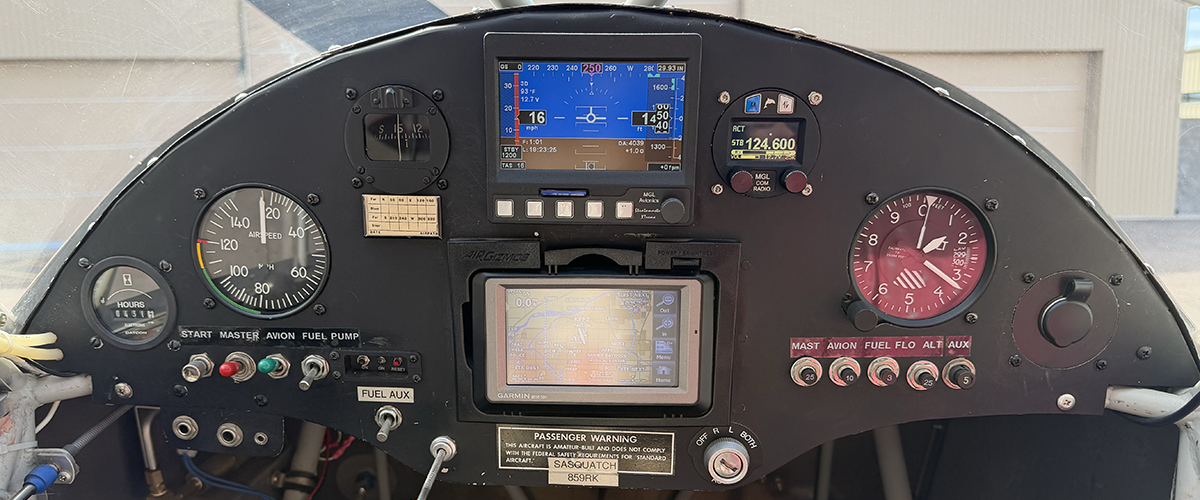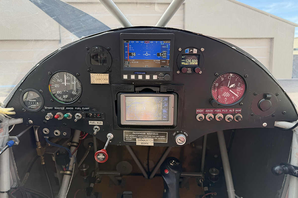 Instrument Panel - As part of the significant effort made by the builder to keep this aircraft as light as possible, the minimalist panel has only the required VFR instruments, complimented by a digital "glass panel-style" PFD. The MGL display contains an integrated transponder, a primary display artificial horizon, a compass, and turn-and-bank functionality. In place of a typical fuel gauge, the MGL system utilizes the highly regarded, TSO'd MGL fuel flow sensor "cube" which feeds fuel information to the MGL primary flight display.